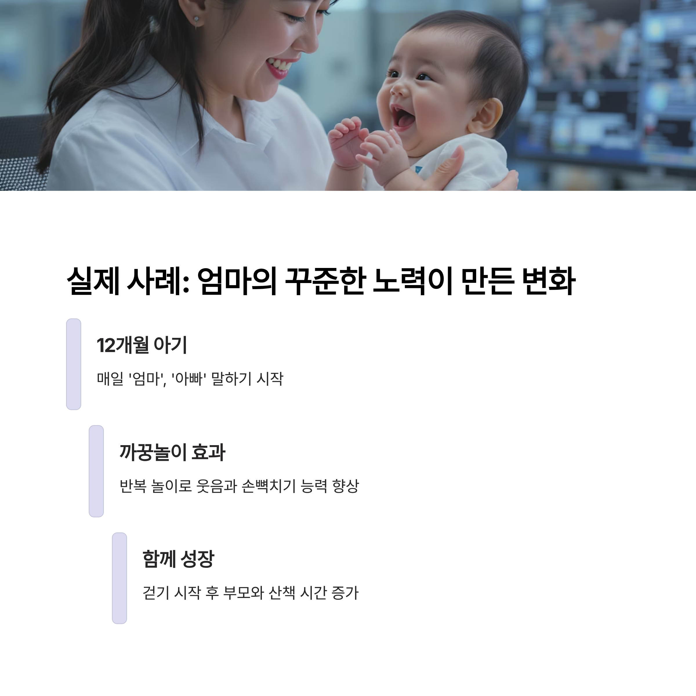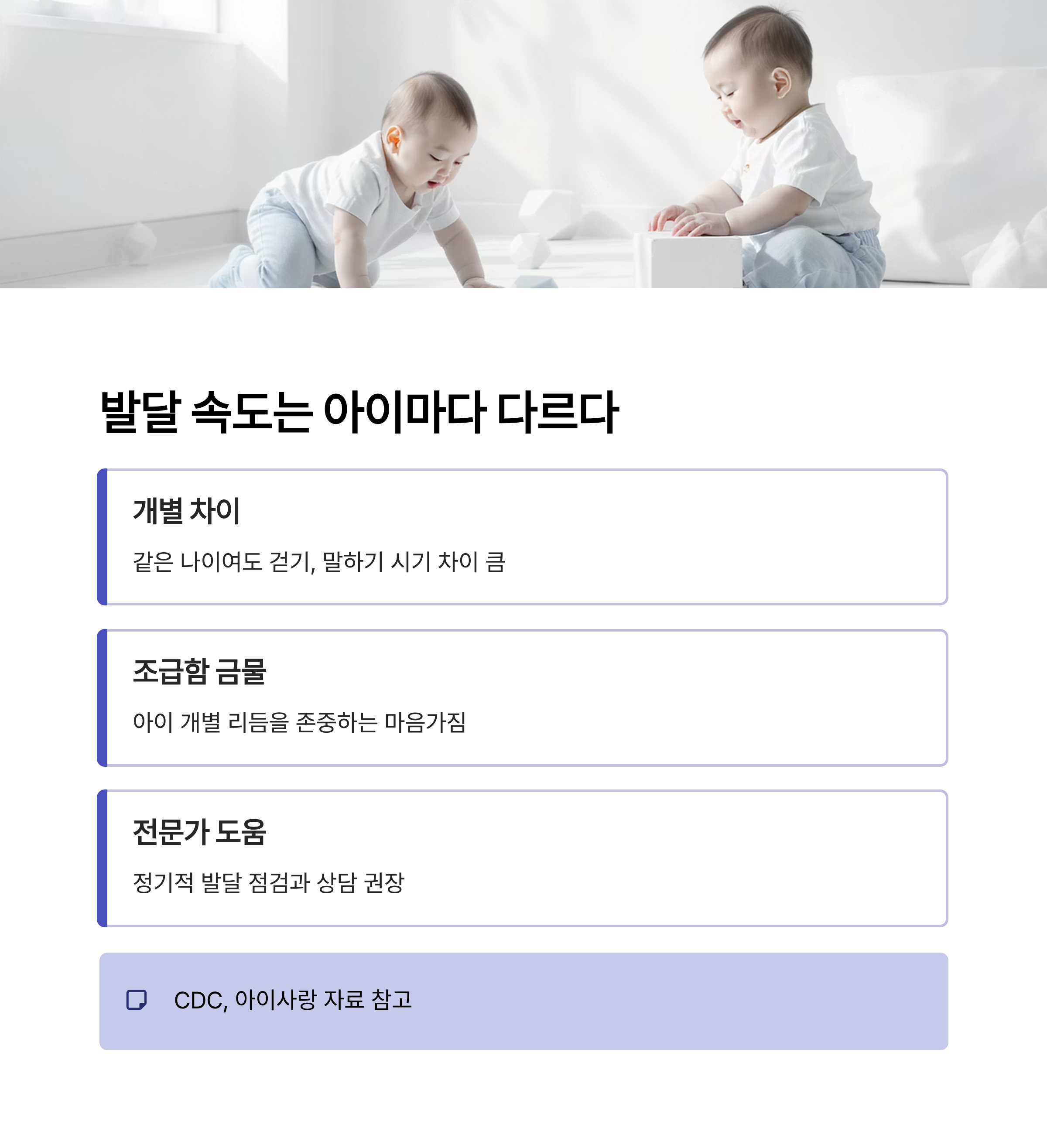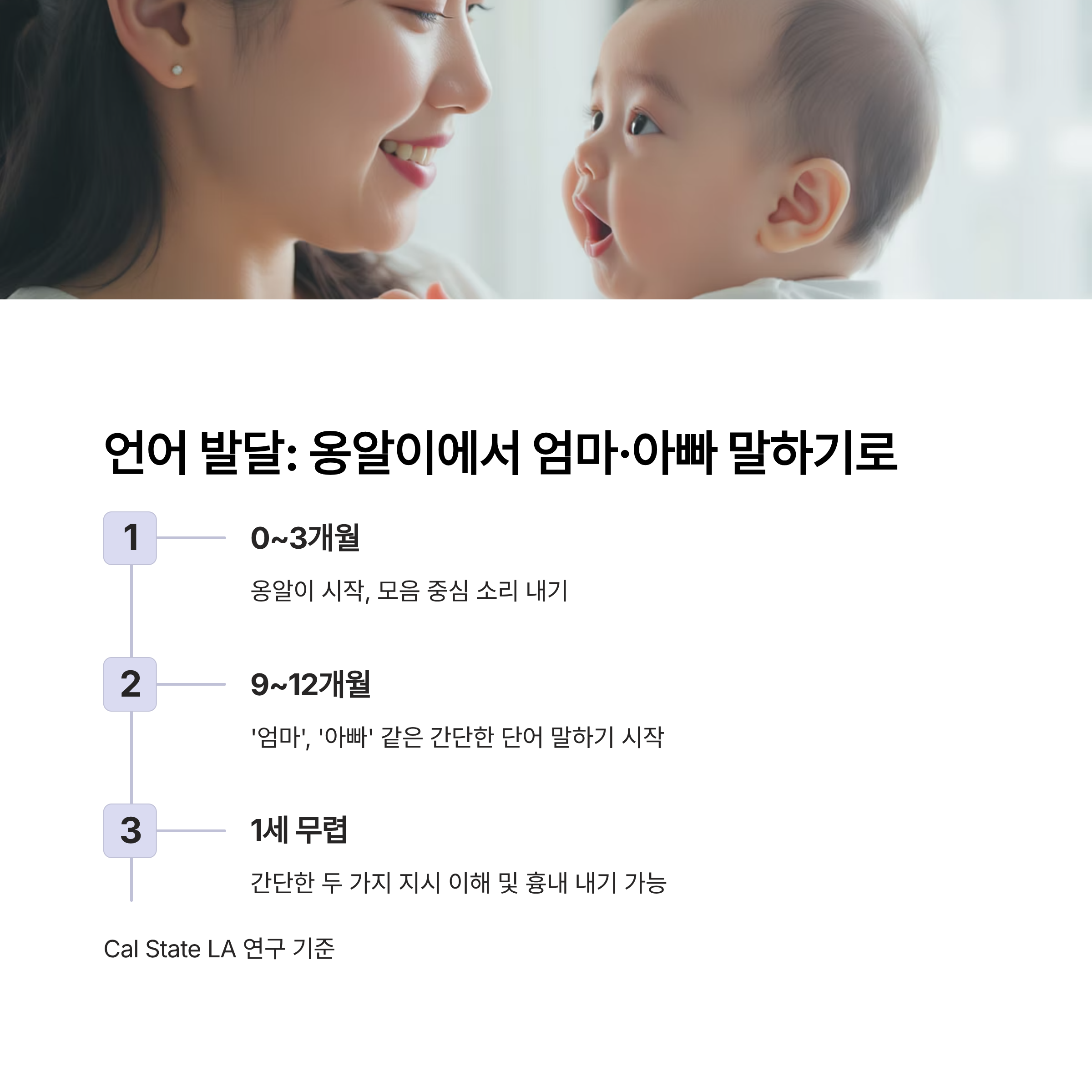 | 언어 발달 | 옹알이에서 ‘엄마’, ‘아빠’ 등 의미 있는 단어 발화로 연결됩니다. |