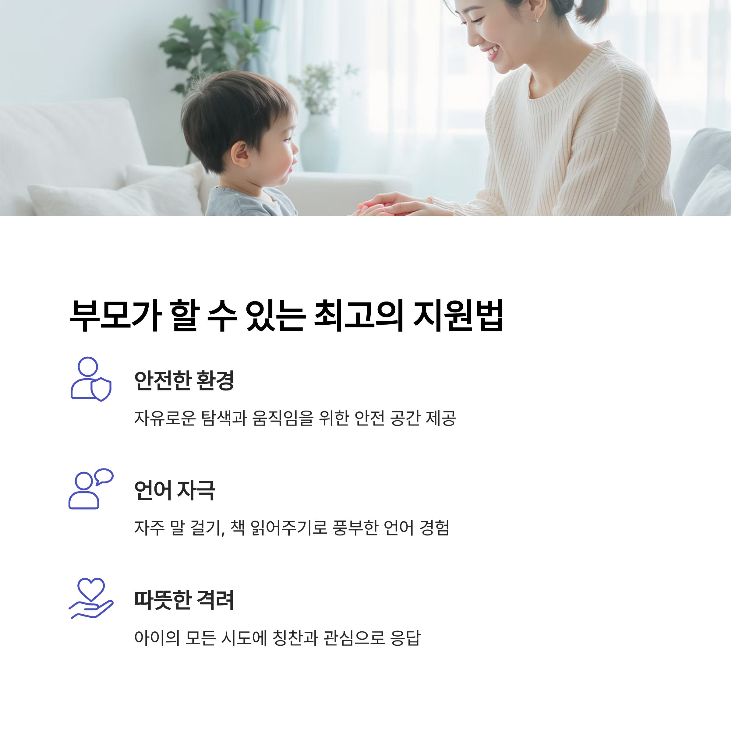 | 안전한 환경 제공으로 자율적 움직임 지원 | 풍부한 언어 자극과 놀이를 통한 학습 필요 | 긍정적 피드백과 칭찬이 사회성 발달에 기여 |
