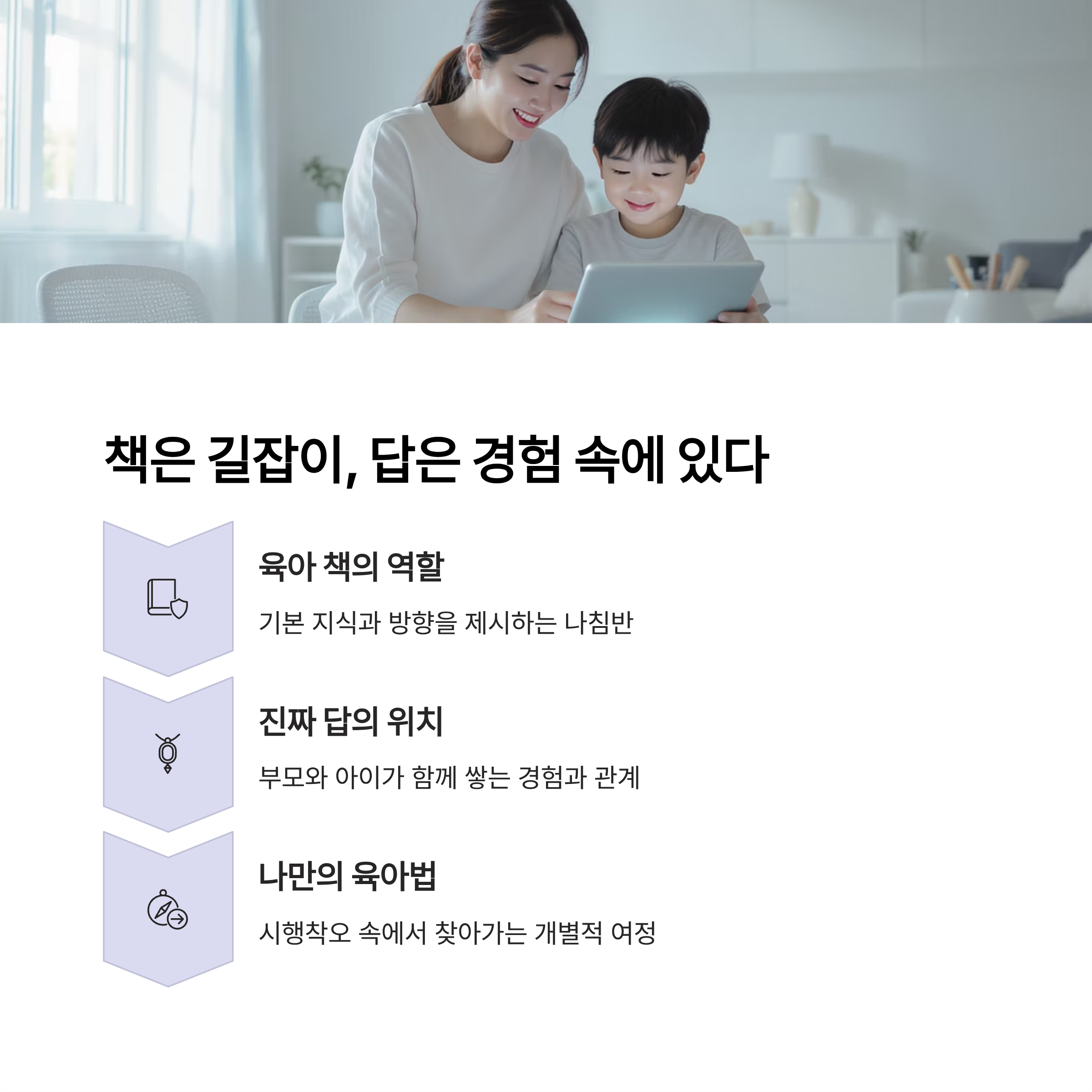 육아는 누구에게나 새로운 여정입니다. 아무리 많은 책을 읽어도, 실제 경험에서 오는 놀라움과 어려움은 항상 존재합니다. 아이는 하루가 다르게 변하고, 부모도 그 변화에 맞춰 함께 성장합니다. 그렇기에 부모는 책 속 지식을 절대적인 답으로 여기기보다, 참고하고 응용할 수 있는 도구로 바라봐야 합니다. 때로는 책의 방법이 효과적일 수 있지만, 또 다른 순간에는 전혀 통하지 않을 수 있습니다. 이런 경험을 실패로 여기지 말고, 아이와 나만의 방식을 찾아가는 과정으로 이해하는 것이 중요합니다. 부모가 완벽할 필요는 없습니다. 다만 매 순간 최선을 다하고, 아이와 함께 웃고 울며, 성장하는 과정을 사랑스럽게 받아들이는 것만으로 충분합니다. 결국 육아는 정답이 아니라 '함께 만들어가는 이야기'이며, 그 길 위에서 부모와 아이 모두가 서로에게 가장 큰 선물이 됩니다.