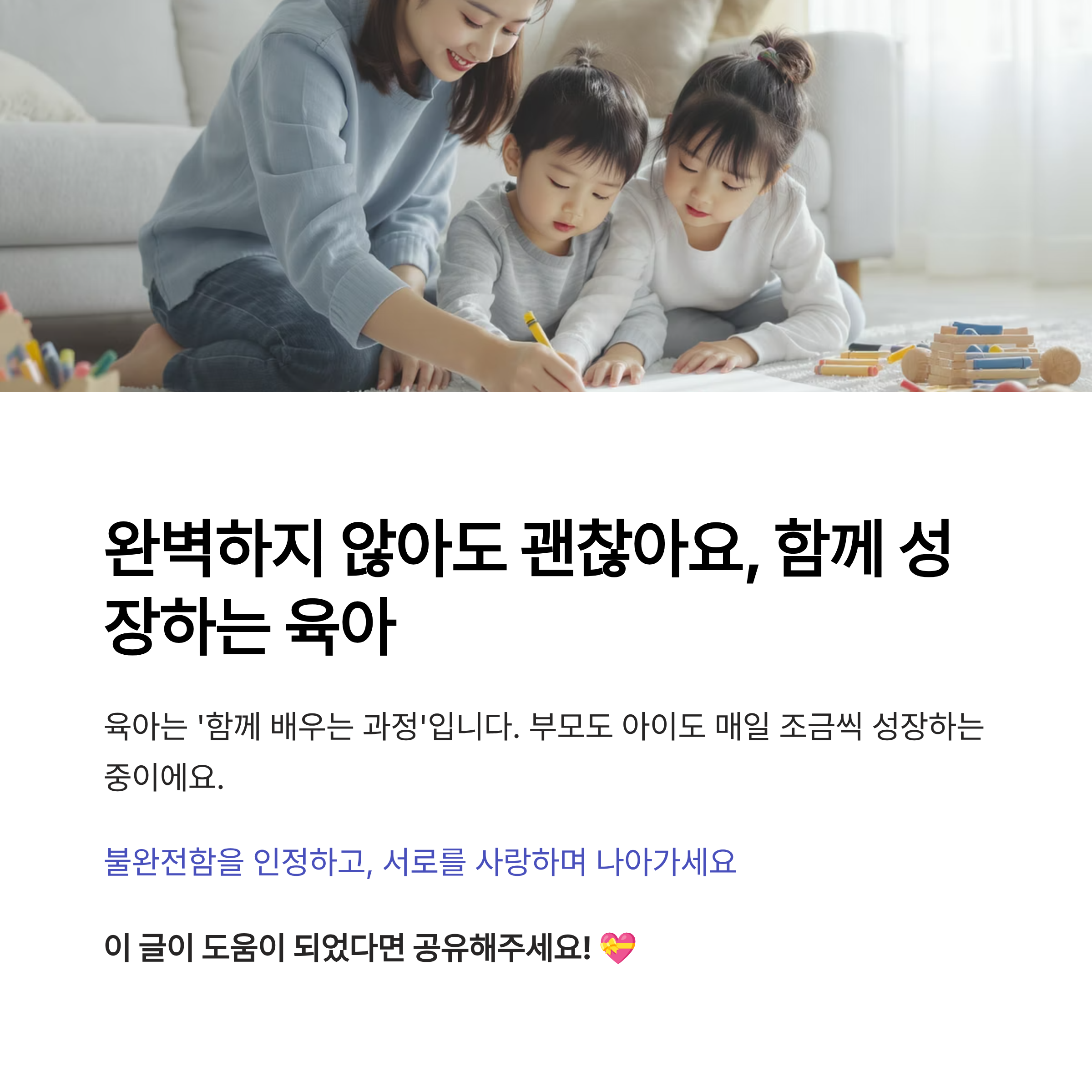 여러분은 육아 책과 현실의 차이를 어떻게 느끼셨나요? 책에서 도움받은 부분이나, 실제로 전혀 달랐던 경험담이 있다면 댓글로 공유해주세요. 같은 길을 걷는 부모들에게 여러분의 이야기는 큰 위로와 힘이 될 수 있습니다. 자유롭게 의견을 나누며 함께하는 공간이 되었으면 좋겠습니다.