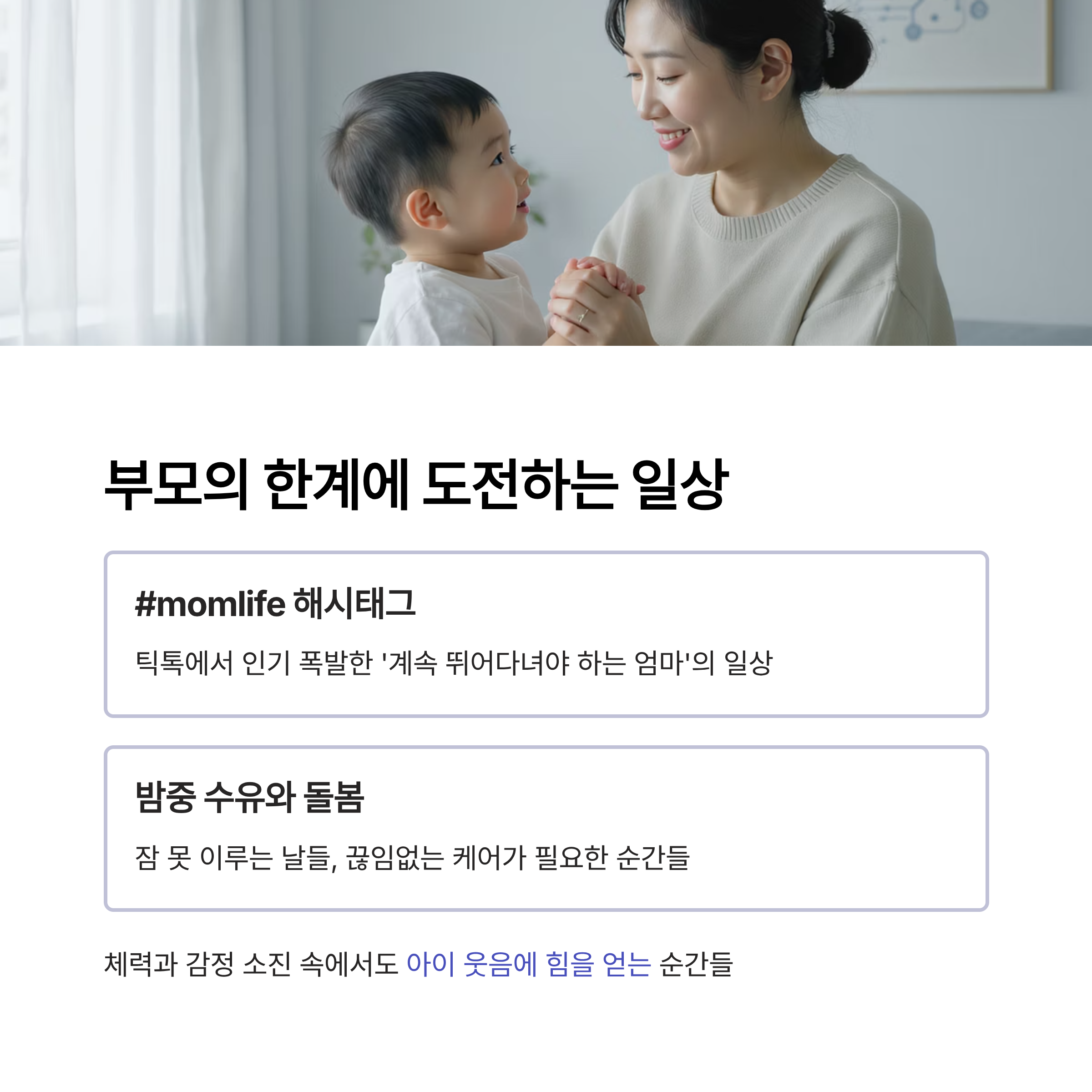 | 부모의 감정 | 사랑과 행복이 크지만 동시에 불안, 걱정, 지침이 함께합니다. |