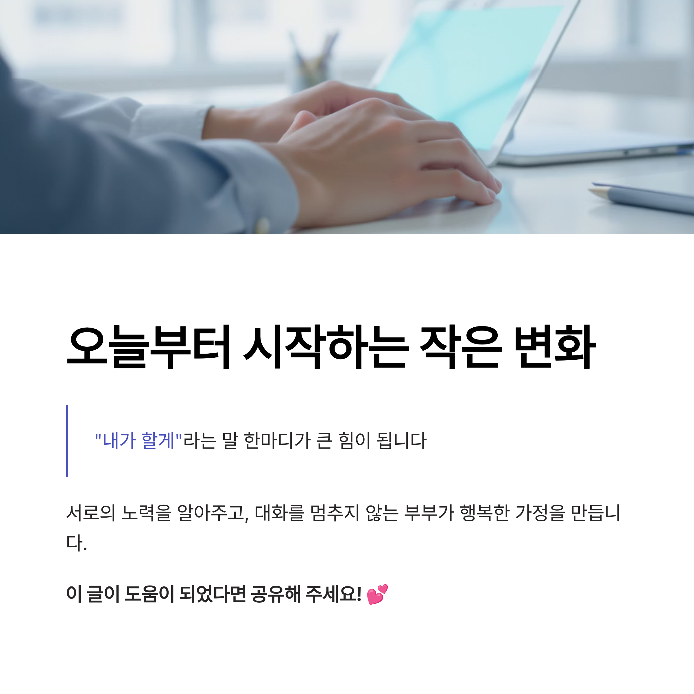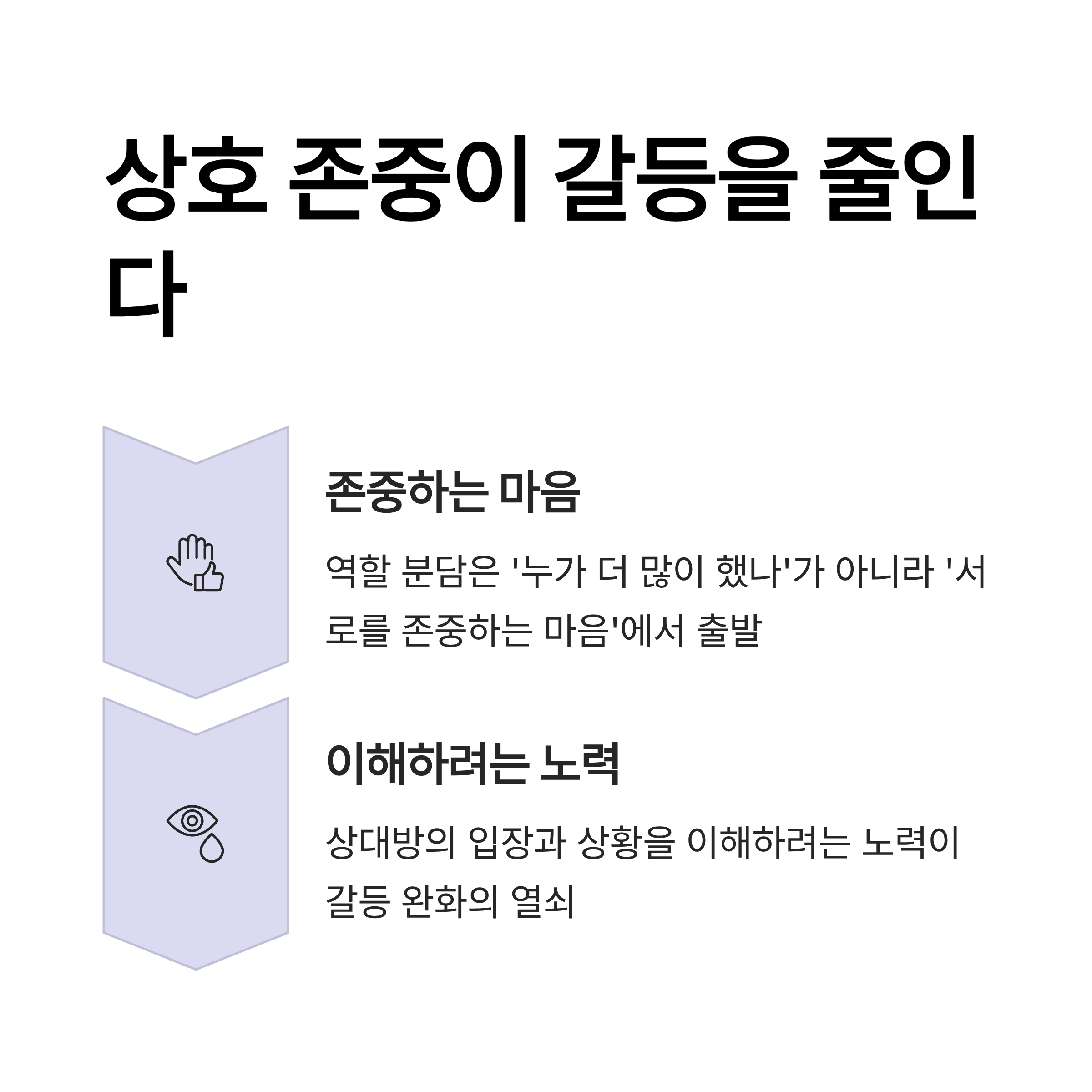 | 역할 분담의 첫걸음은 솔직한 대화 | 서로의 노고를 인정하고 존중해야 균형 유지 | 상황에 따라 조정 가능한 태도가 필요 |
