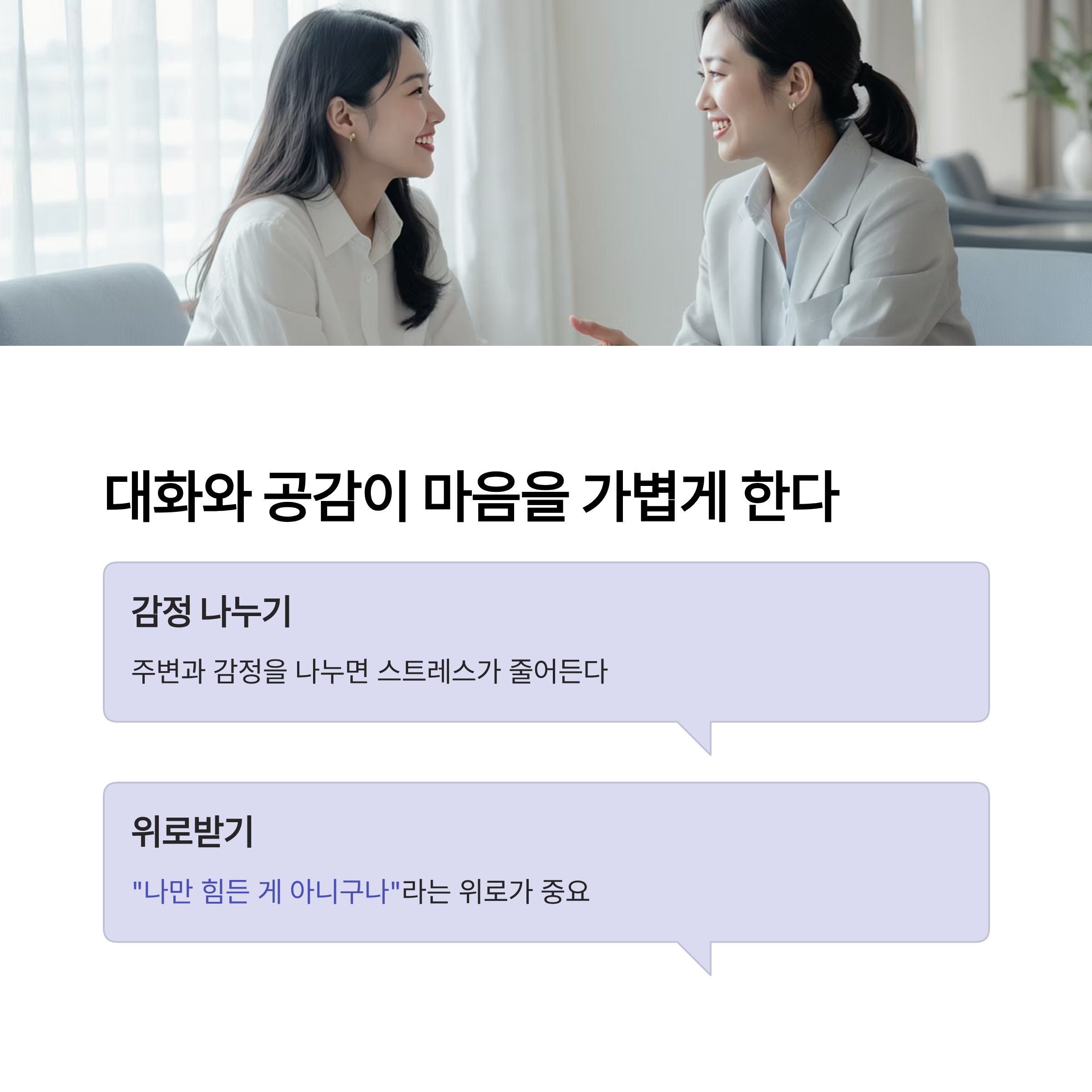 | 작은 여유로 회복 | 성취감과 즐거움 제공 | 공감과 위로로 마음 완화 |