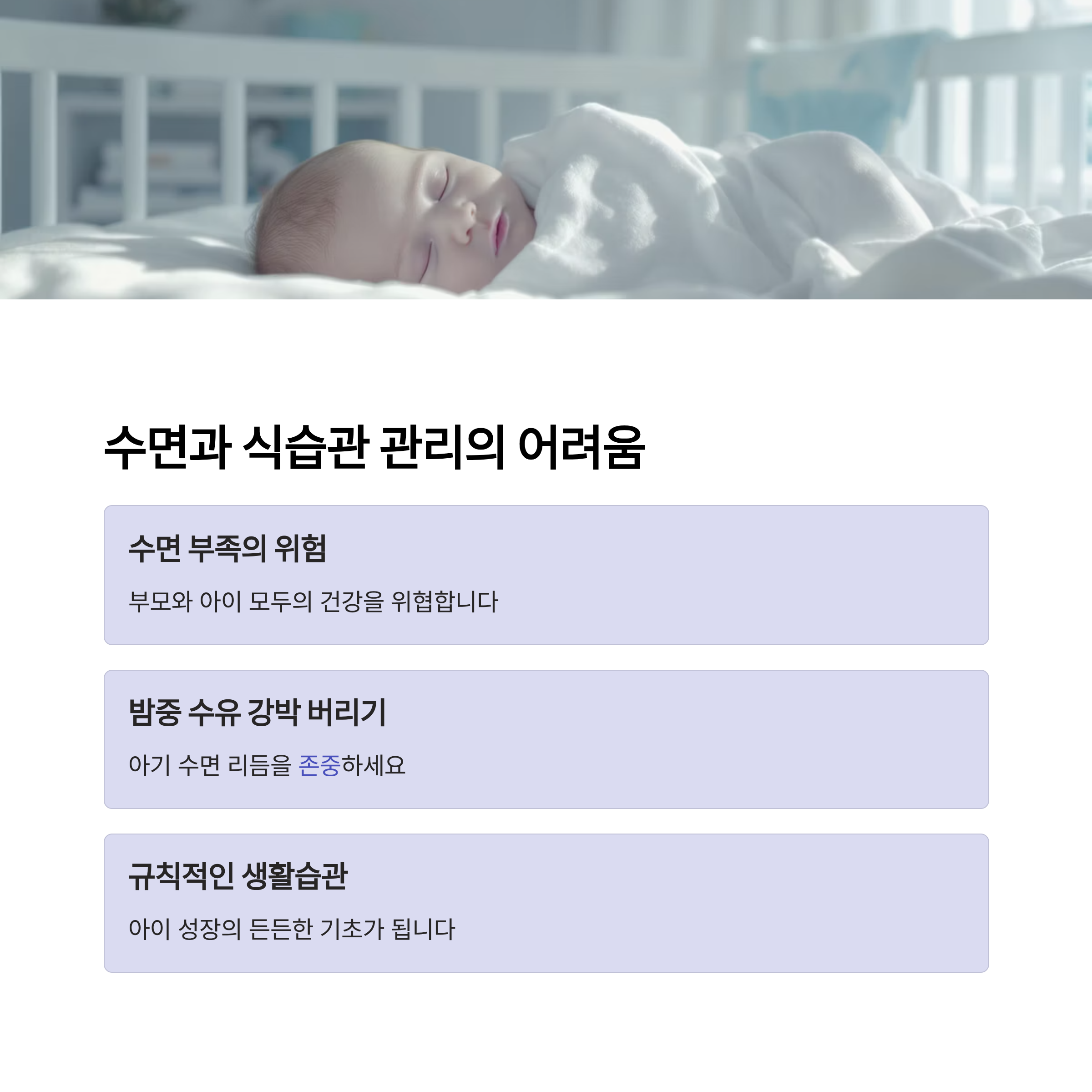 | 수면 습관 | 일정하지 않은 수면 습관은 아이의 정서와 건강에 직접적인 영향을 줍니다. |